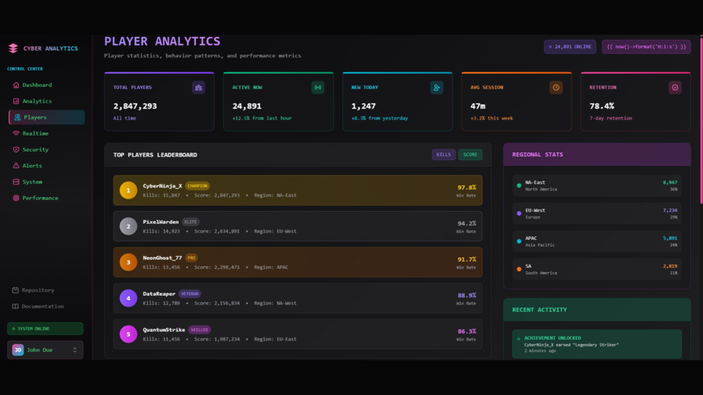 Analytics is a premium, developer-focused dashboard UI kit built with clean, semantic HTML and styled entirely using Tailwind CSS. It’s crafted for data analysts, developers, and businesses needing a high-performance, visually striking interface for real-time analytics and monitoring in gaming, security, and system performance.
